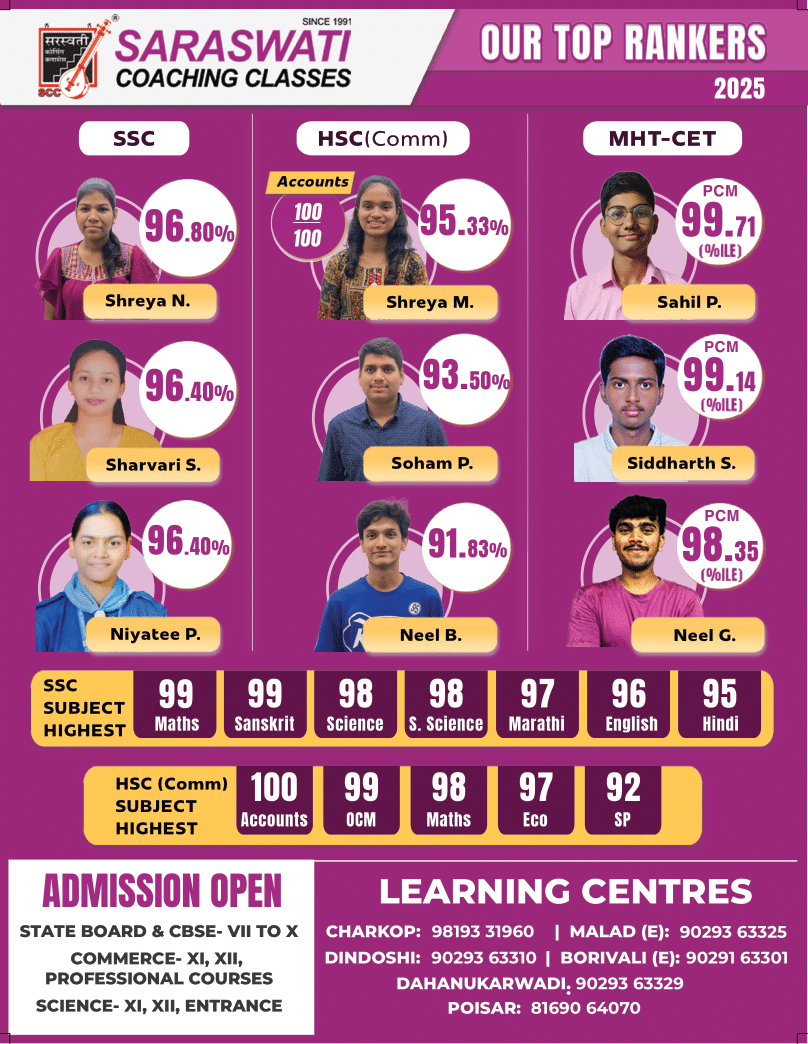 The bright performances of Saraswati Coaching Classes’ students year after year have been the